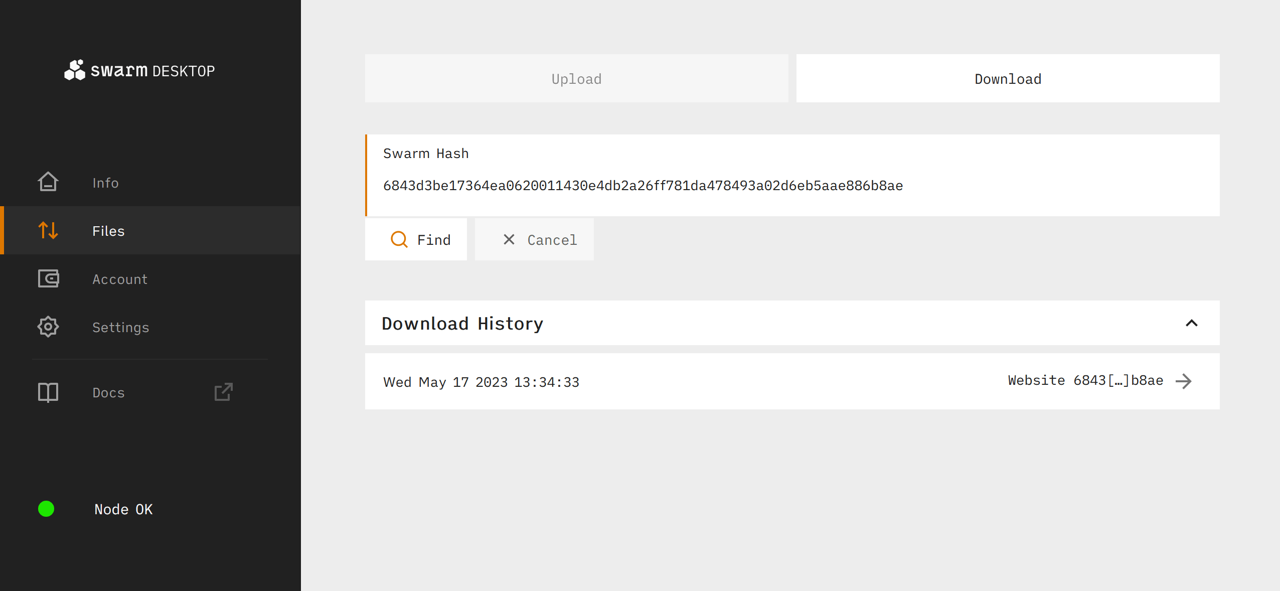 From there, paste the Swarm hash for the content you want to access, and click Find. We'll use the hash for a Swarm blog post explaining how to upload a website to Swarm:
