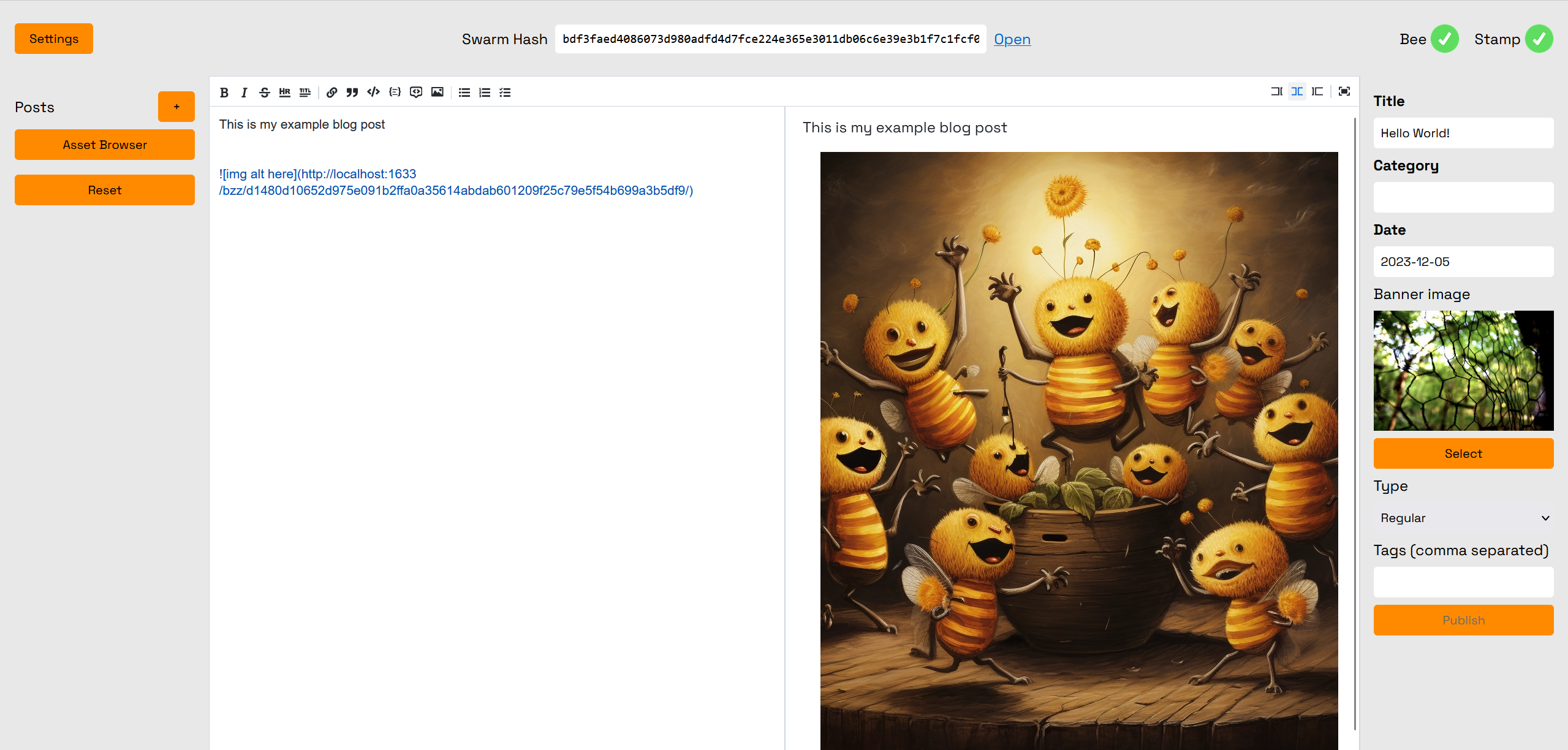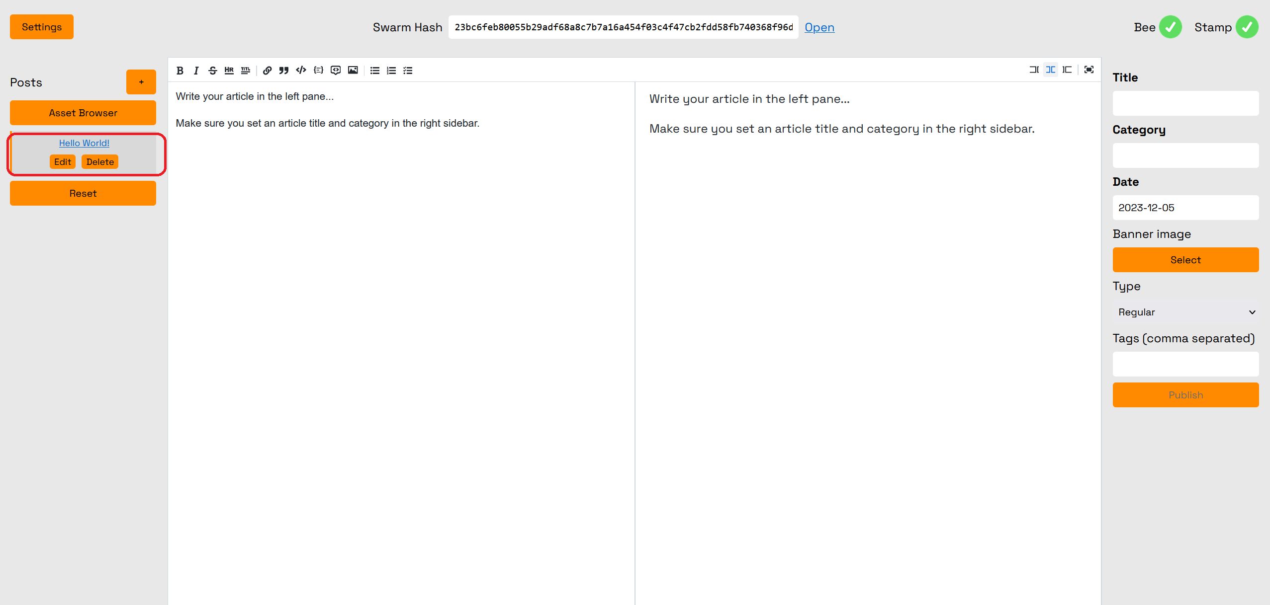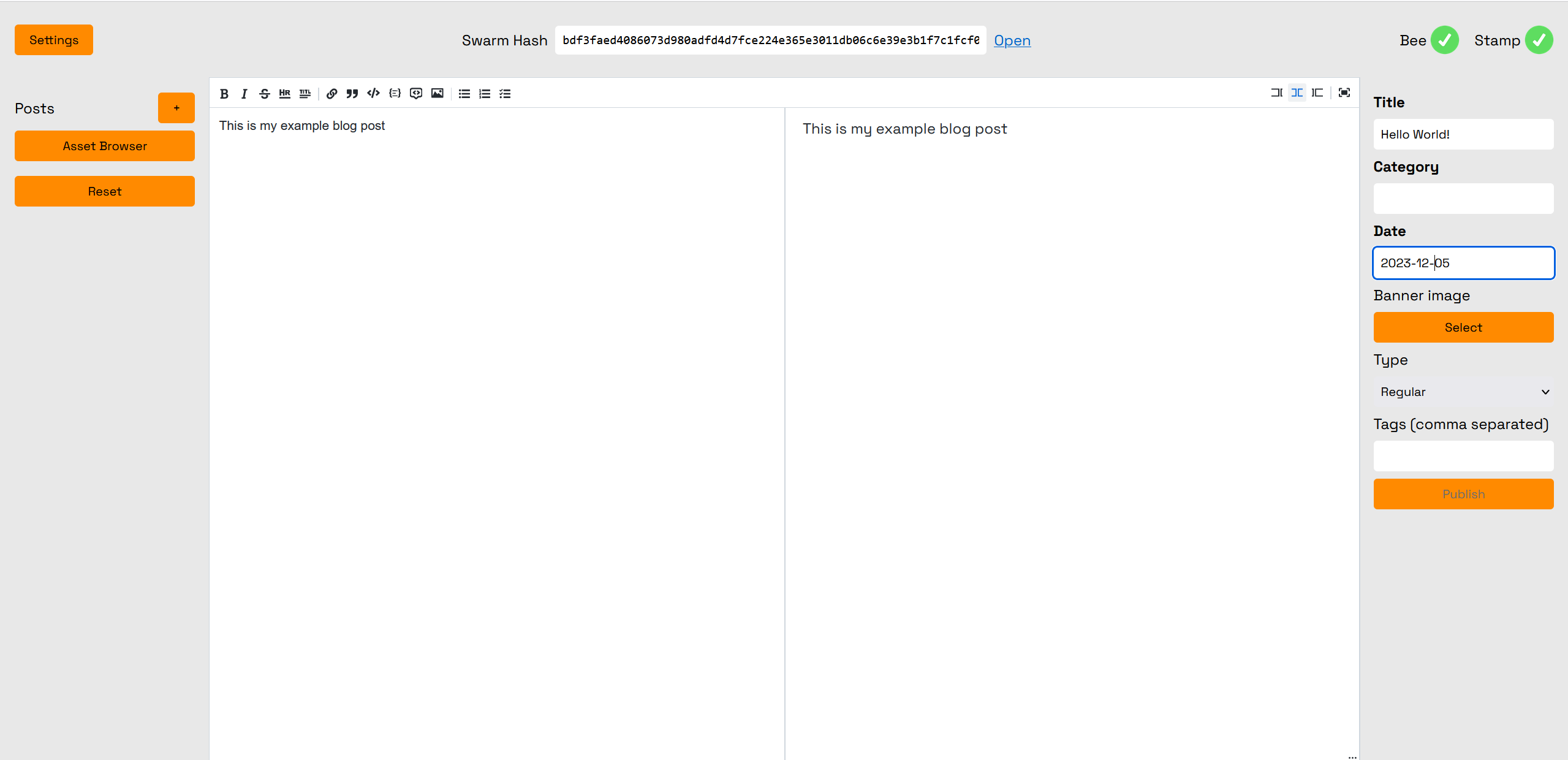 Now we are ready to publish our first blog post! Simply click the "Publish" button to initiate the transaction on Swarm to upload your blog.