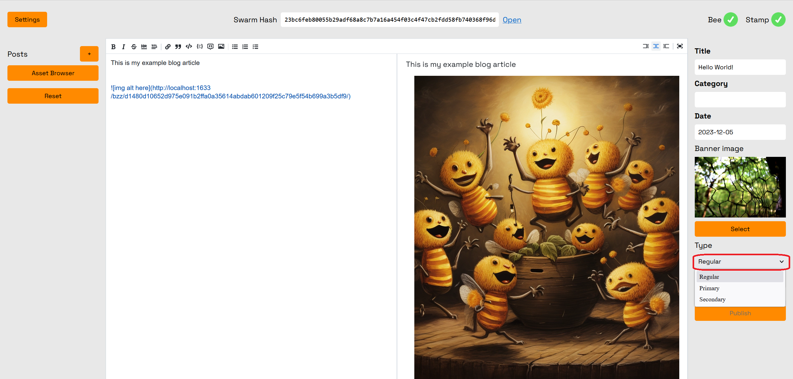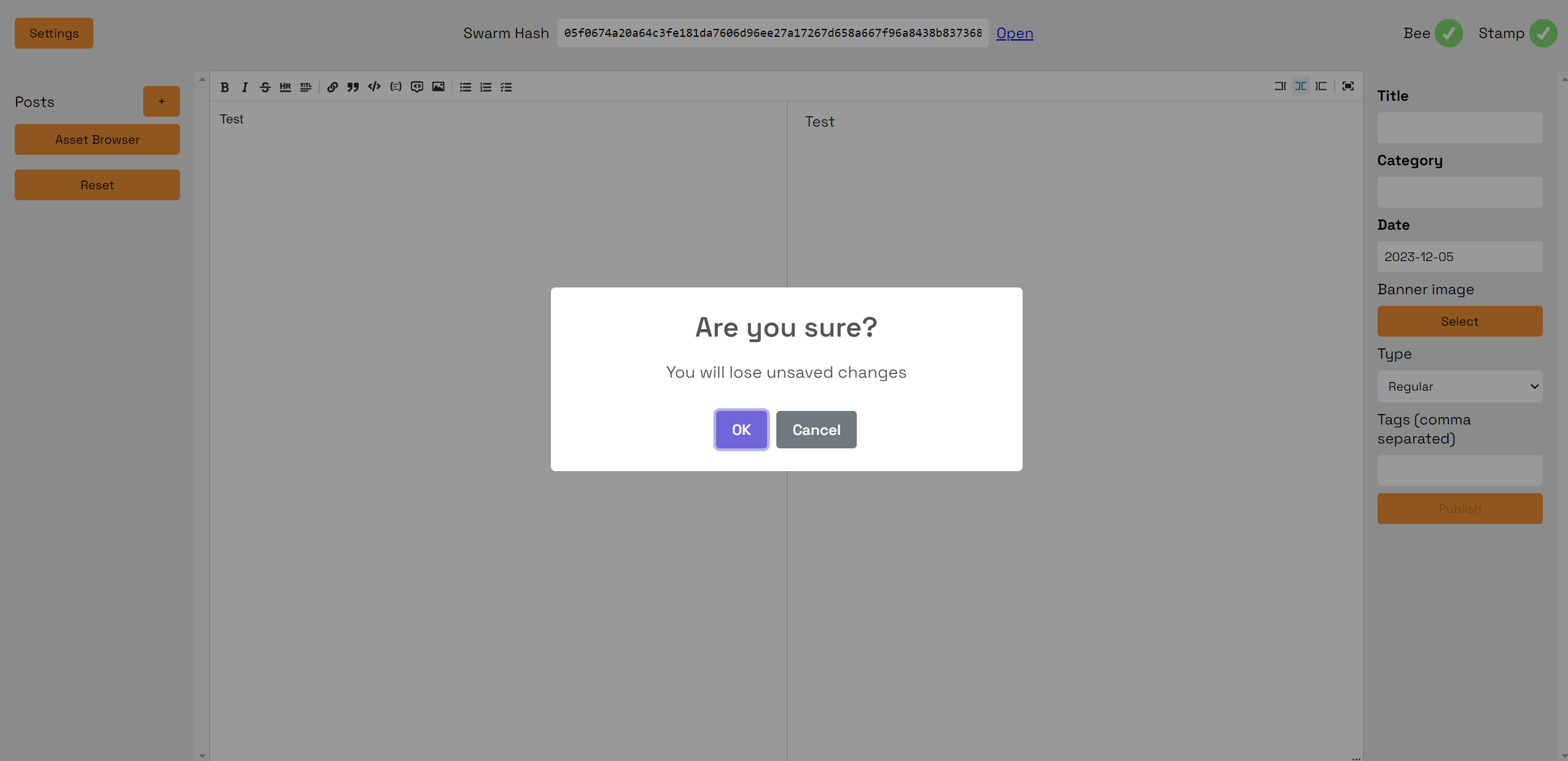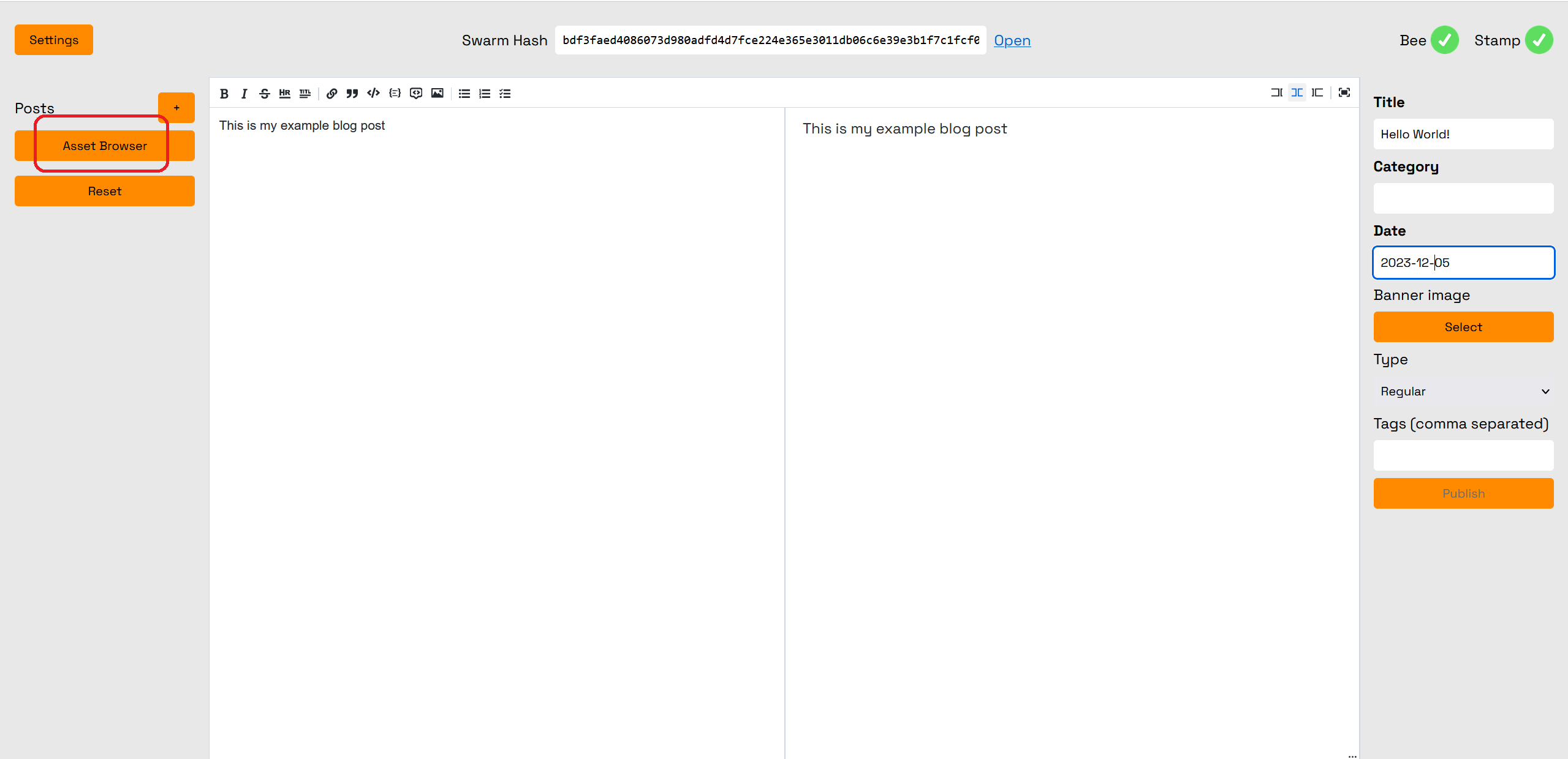 Now we are ready to publish our first blog post! Simply click the "Publish" button to initiate the transaction on Swarm to upload your blog.