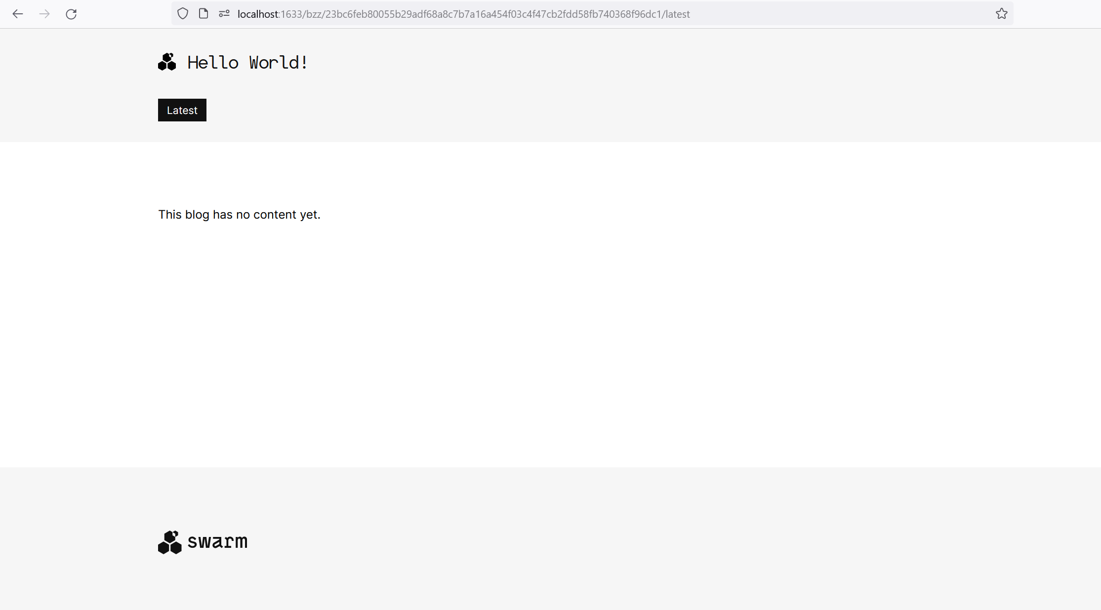 The "Swarm Hash" displayed at the top of the editor is the address for the homepage of your blog. Click "Open" to navigate to your blog. We can see now that the blog has been initialized, but no content has been uploaded.