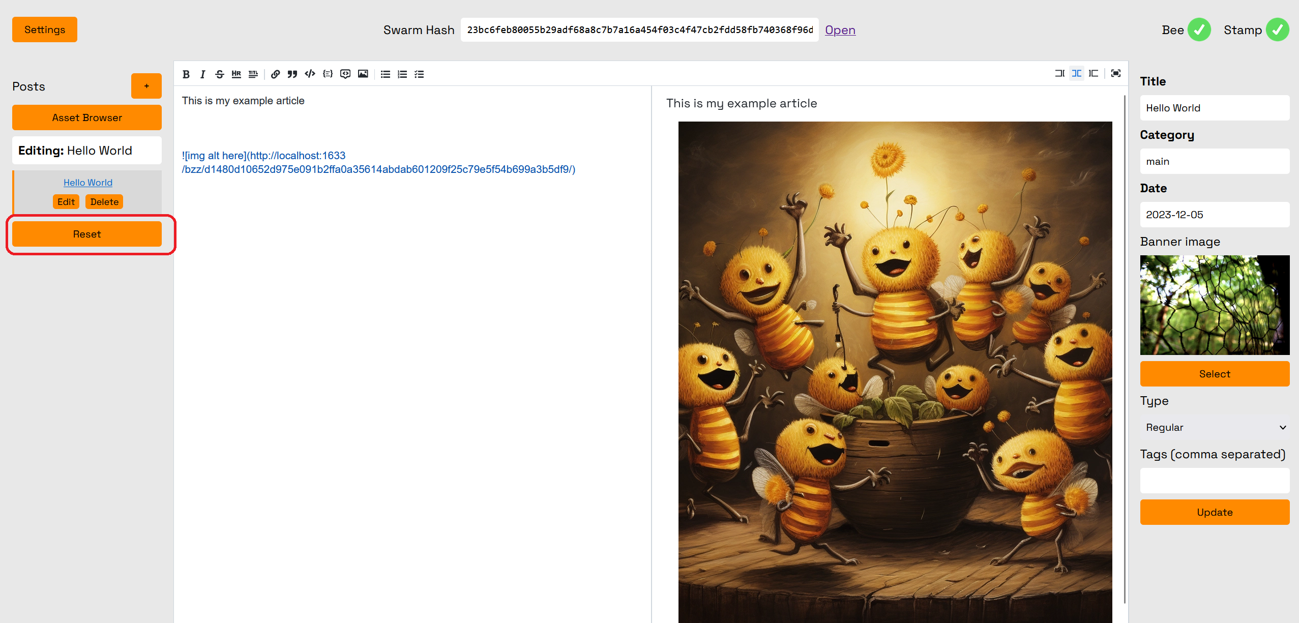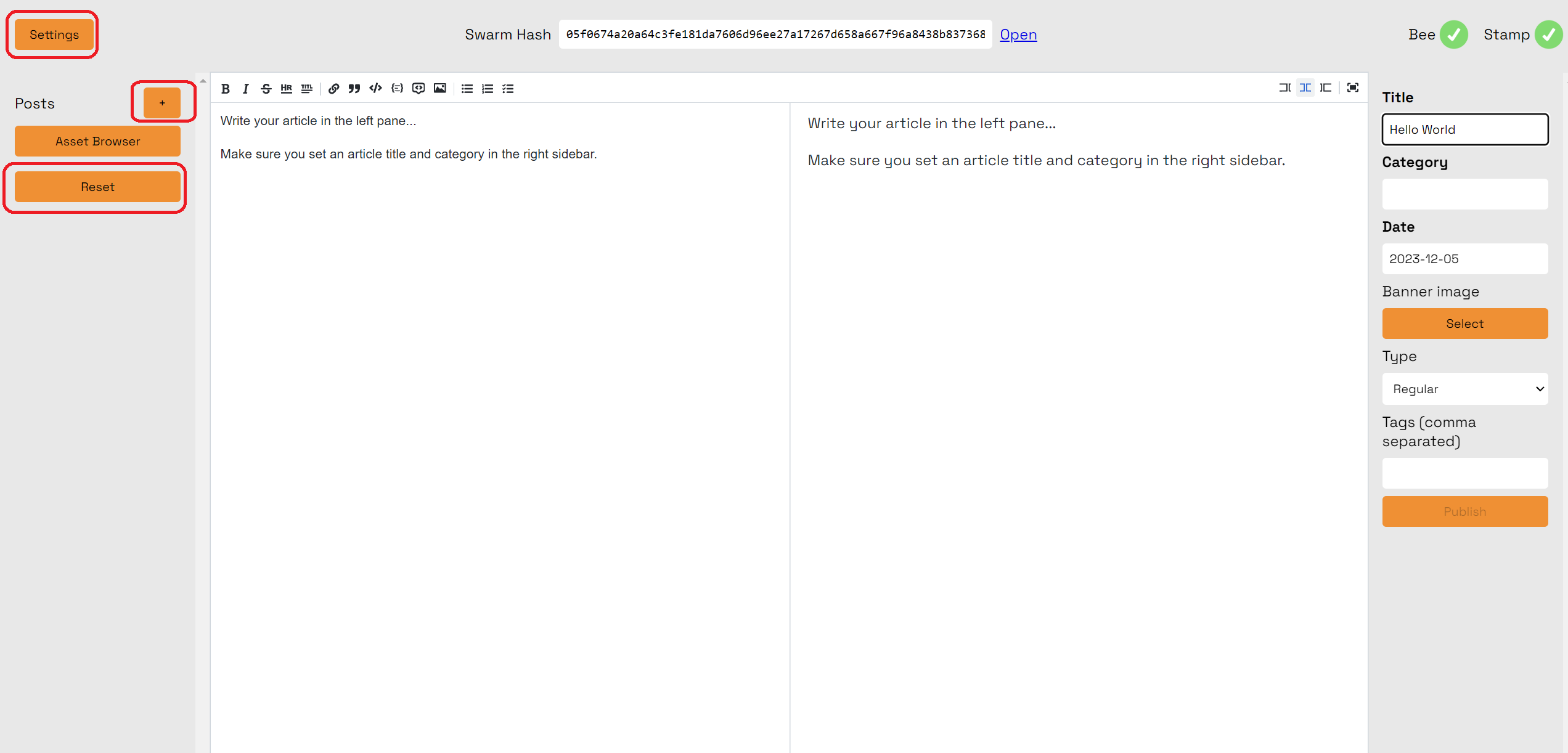 Etherjot currently does not allow you to save drafts locally, so if you navigate away from the blog post you are currently editing, you will lose any changes you have made which have not yet been uploaded to Swarm. Take note of the three UI elements highlighted in the screenshot - using the "+" or "Settings" buttons will cause you to lose any changes not uploaded to Swarm, and hitting the "Reset" button will cause you to lose everything which has not been backed up.