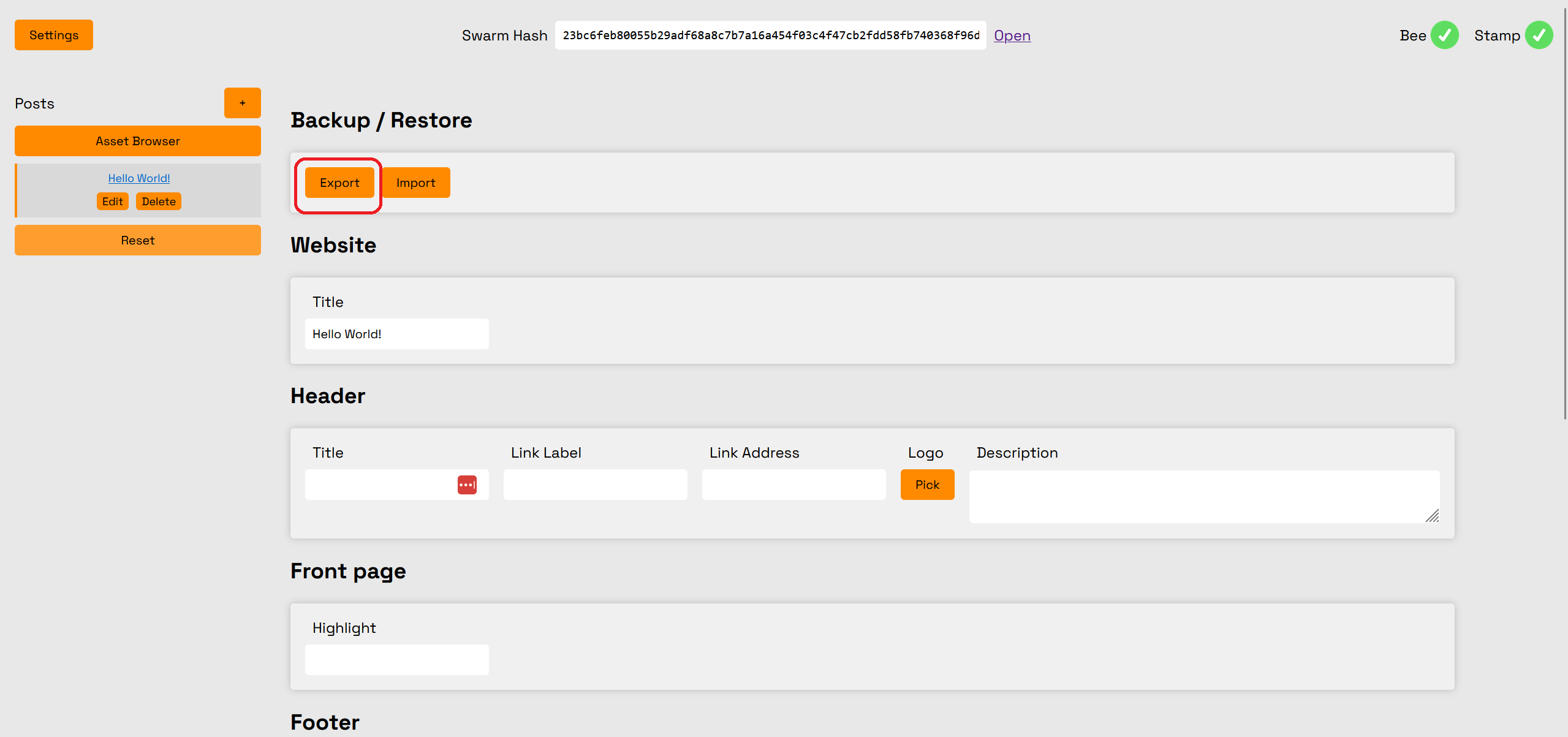 In addition to monitoring your postage stamp batch TTL, it is also important that you back up your blog, or else you may lose access to your blog in Etherjot (although it will still remain live on Swarm as long as its stamp batch has not expired).