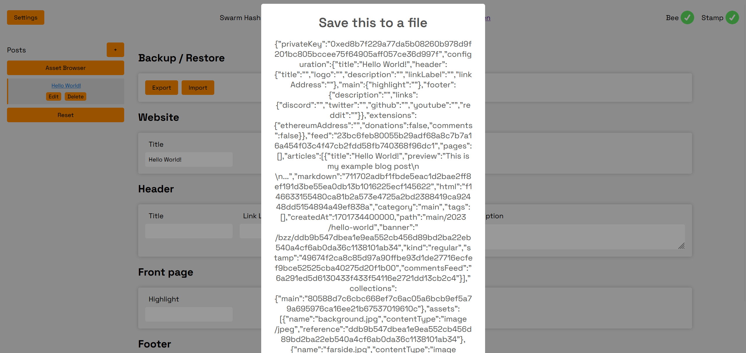 Copy the displayed text to a .json file, make certain to copy the entire displayed text. This is your backup file and is used to import your blog. Note that the backup contains the private key of your blog, so should not be revealed to anyone else.