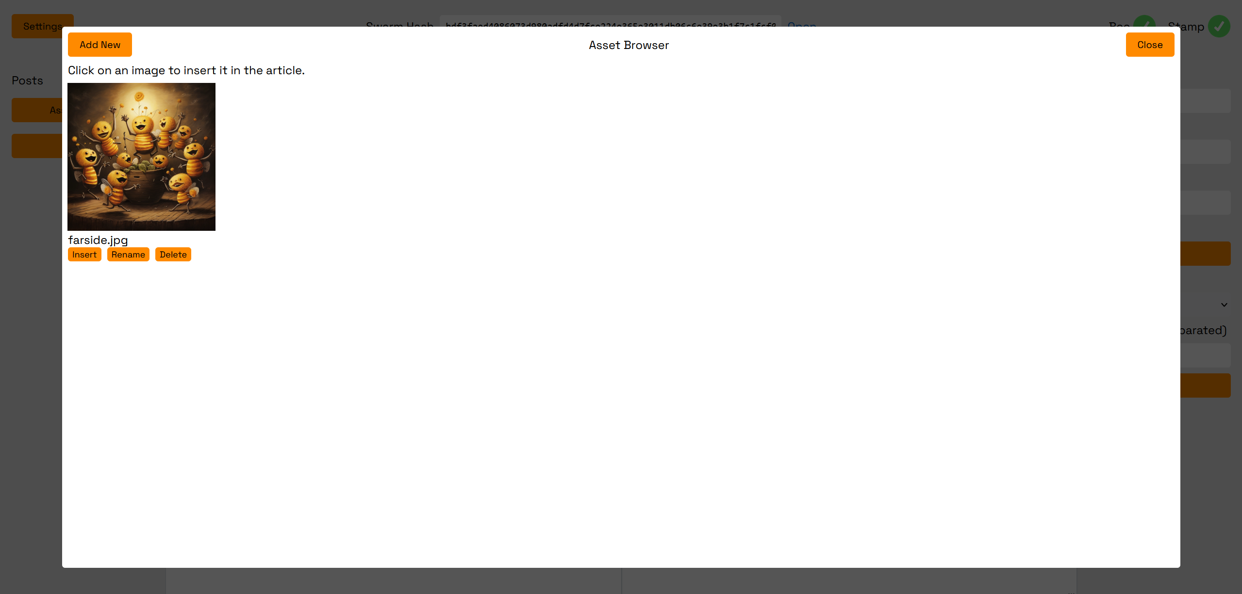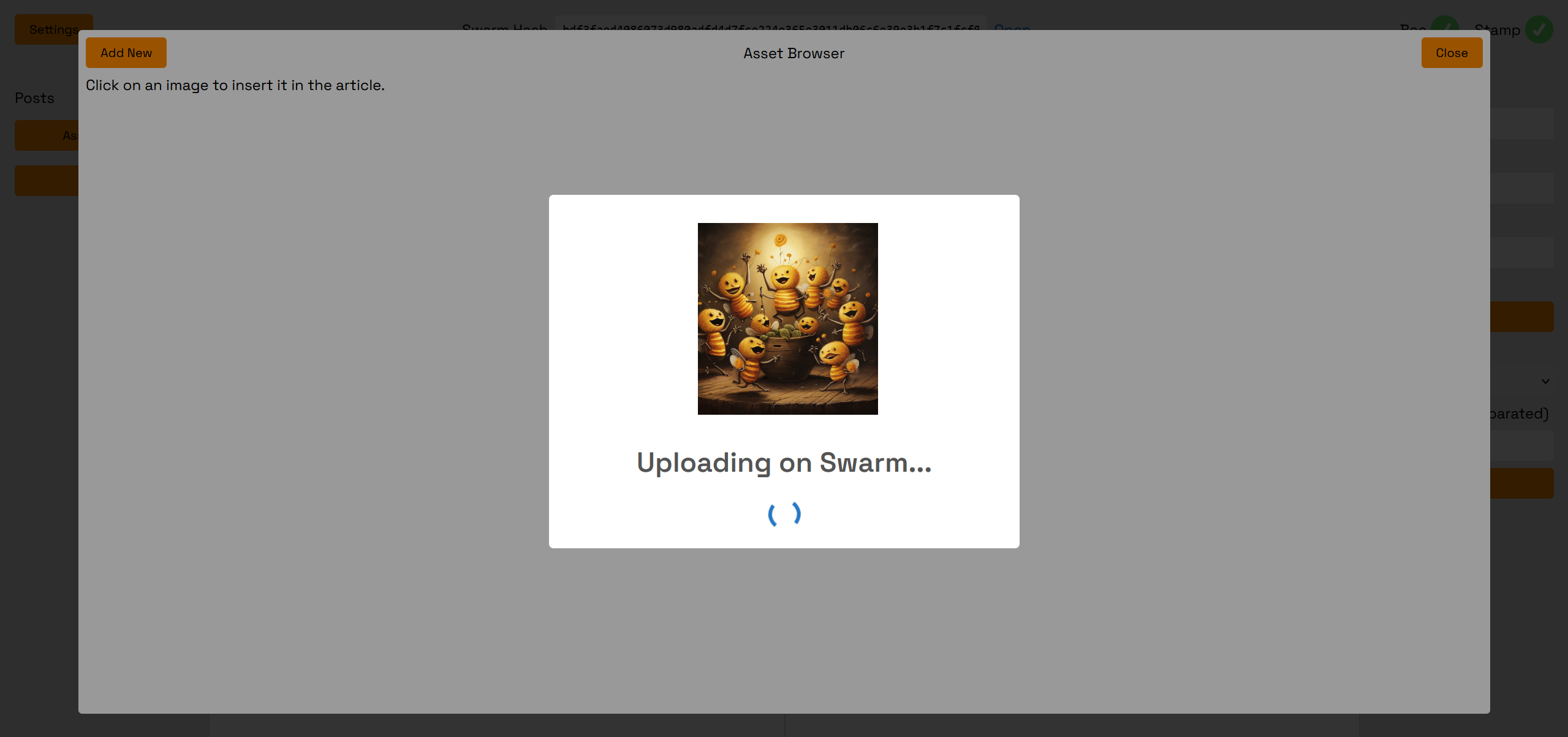 After hitting "Insert", the URL with the Swarm hash of the file you just uploaded will be automatically inserted into a markdown image tag, and will then become viewable in the preview panel on the right.
